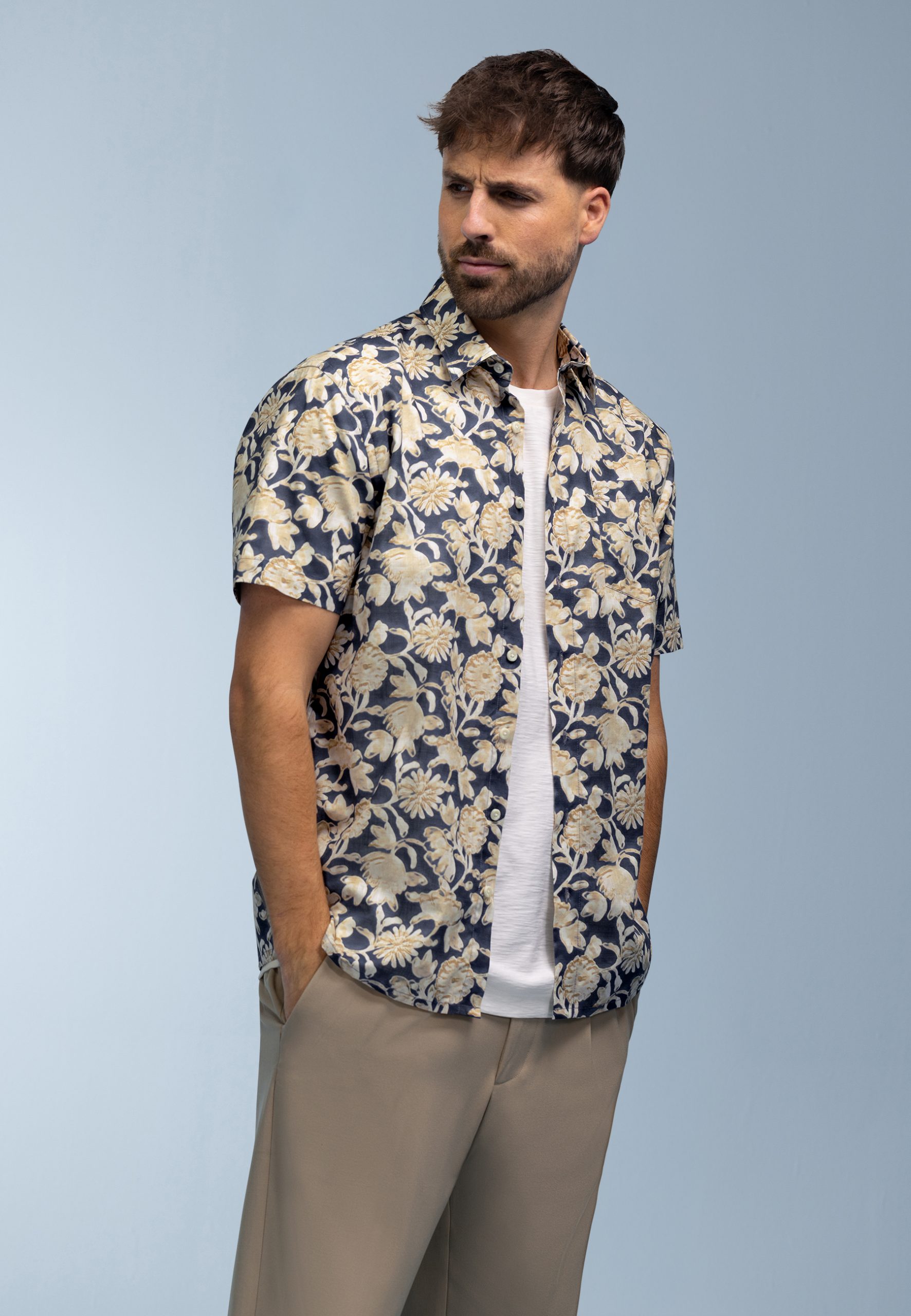 Dit katoenen overhemd met bloemenmotief heeft een comfortabele regular fit en korte mouwen, ideaal voor warmere dagen. De speelse bloemenprint geeft het ontwerp karakter, terwijl het slubgaren zorgt voor een subtiele structuur. Gemaakt van zuiver katoen voelt het overhemd licht en prettig aan. De afwerking met een borstzak en een kraag zonder button-down draagt bij aan de casual uitstraling. Een stijlvol item dat eenvoudig te combineren is.