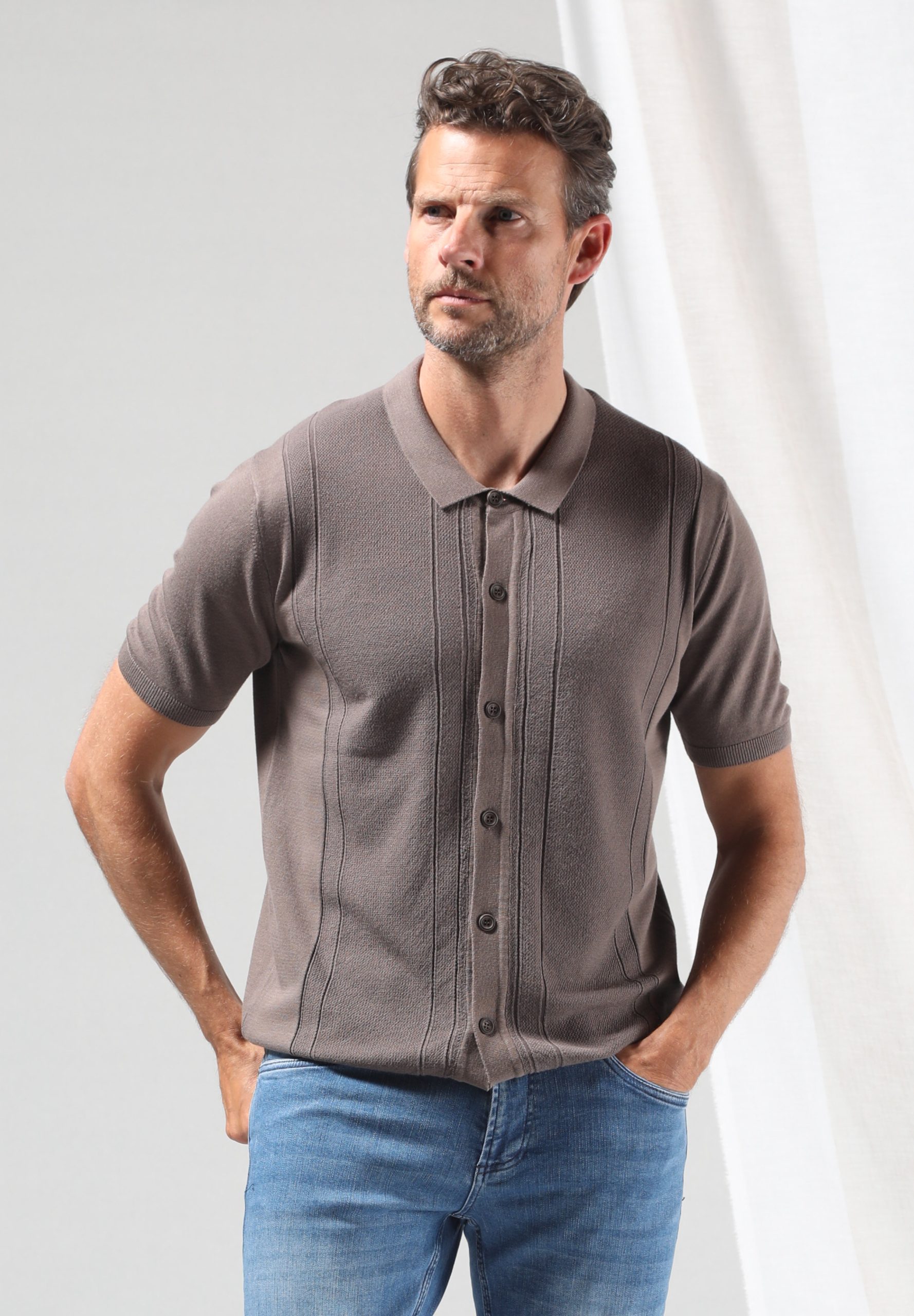 Een moderne doorknoop shirt met korte mouw, gebreid uit een natuurlijke viscosemix voor een luchtig en zacht draaggevoel. De verfijnde structuur en 3D siliconen print op de mouw geven het een eigentijdse uitstraling. Ideaal voor zomerse dagen waarop stijl en comfort samenkomen.
