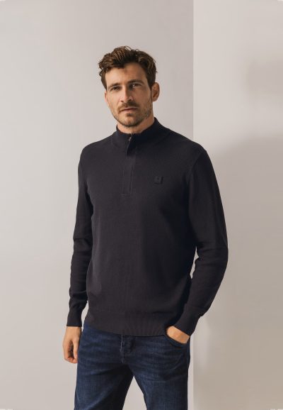 Deze trui met verborgen halve rits en regular fit valt op door het rijstkorrelpatroon, dat zorgt voor een levendige structuur. De rubberen badge op de borst en het subtiele kleuraccent aan de binnenzijde van de kraag geven het ontwerp extra karakter. De mix van viscose en polyamide biedt een soepel gevoel en een lichte glans, ideaal voor dagelijks comfort.
