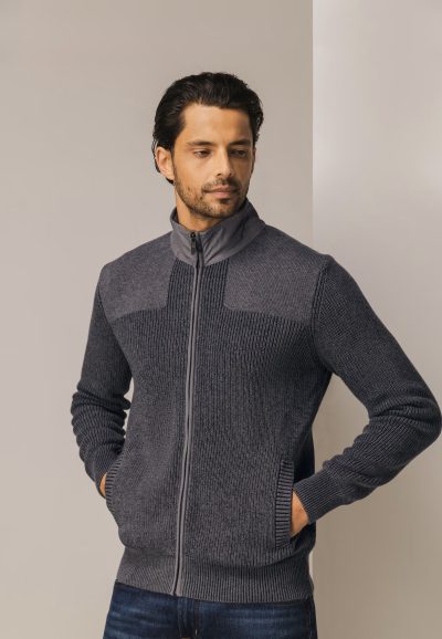 Dit regular fit vest is ribgebreid en heeft gladgebreide vlakken bij de schouders, een verborgen ritssluiting, twee steekzakken en accenten van alcantarastof langs de rits en buitenzijde van de kraag. Het vest is vervaardigd van GOTS-gecertificeerd biologisch katoen, wat zorgt voor een zachte feel en stevige structuur.